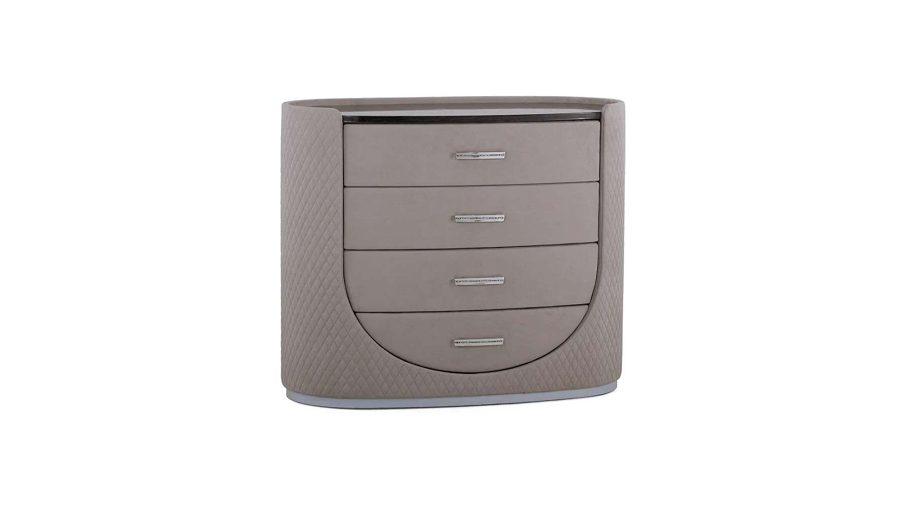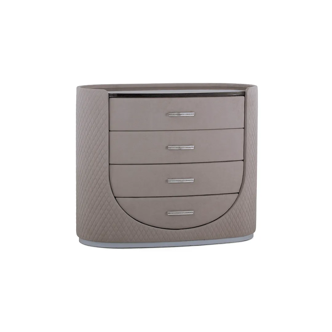 Сочетание стильного дизайна и функциональности. Округлая форма, ромбовидная стежка Chanel на каркасе придают объем и фактурность изделию. Фасад комода выполнен из особопрочной гнутой березовой фанеры. Ручки на ящичках изготовлены с помощью ювелирного литья из олимпийской бронзы и декорированы фирменным логотипом ESTETICA. Ручки могут быть исполнены в нескольких цветах металла: золото, серебро, графит. Комод оснащен фурнитурой от ведущего производителя в мебельной индустрии Hettich.