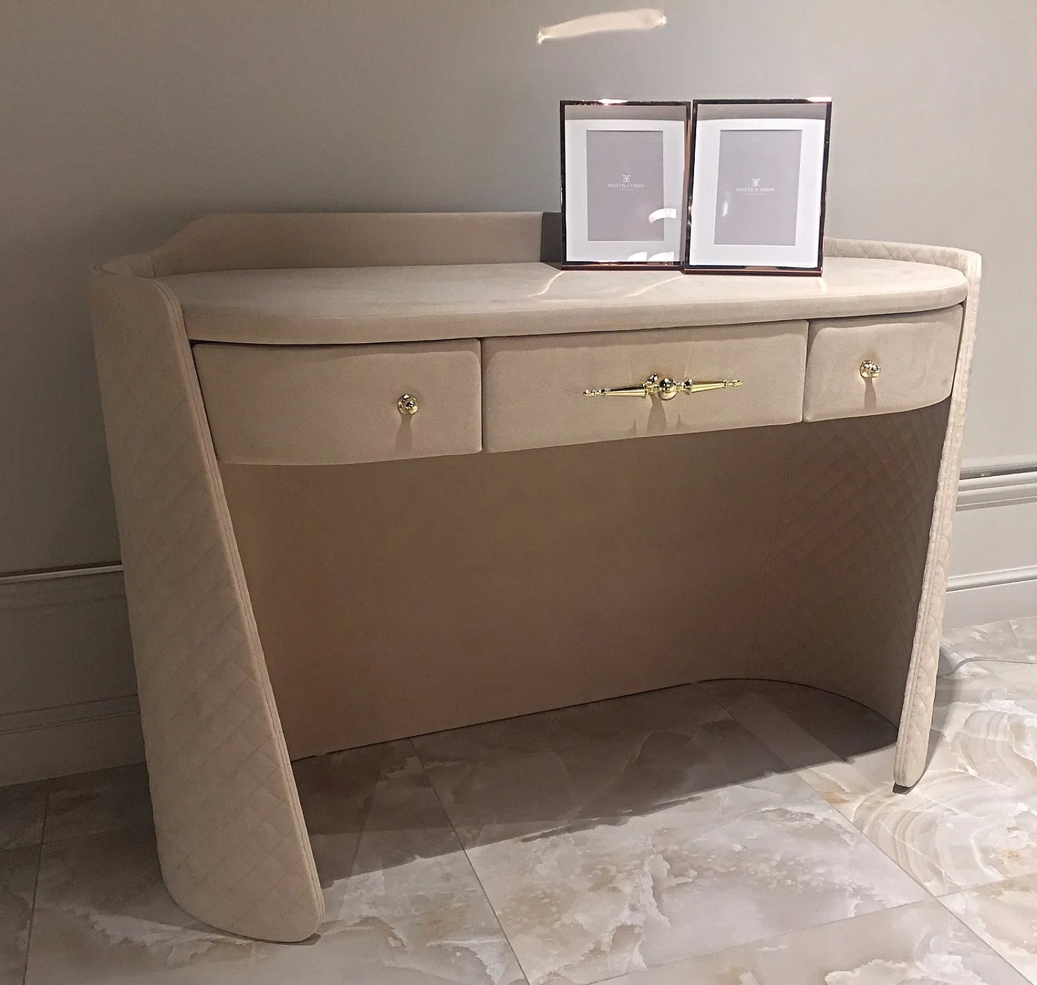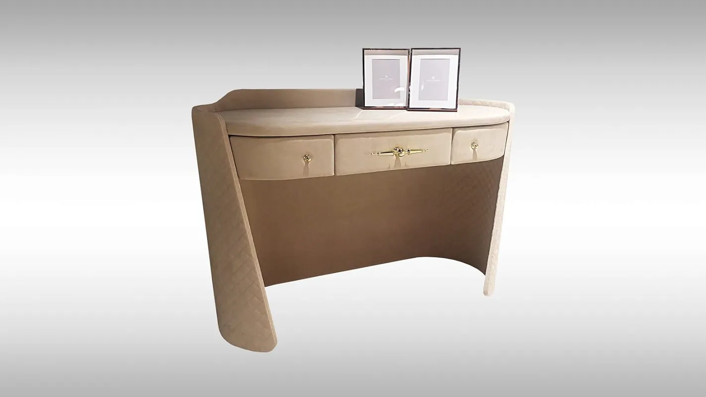Туалетный стол PALLADIUM — функциональный и эстетичный предмет для современного интерьера. Его округлые формы и стежка в стиле Chanel по каркасу придают столу узнаваемый дизайн. Утонченная модель с тремя вместительными ящиками оснащена выразительной фигурной ручкой. Столешница доступна в трёх вариантах: ткань, зеркало или камень.