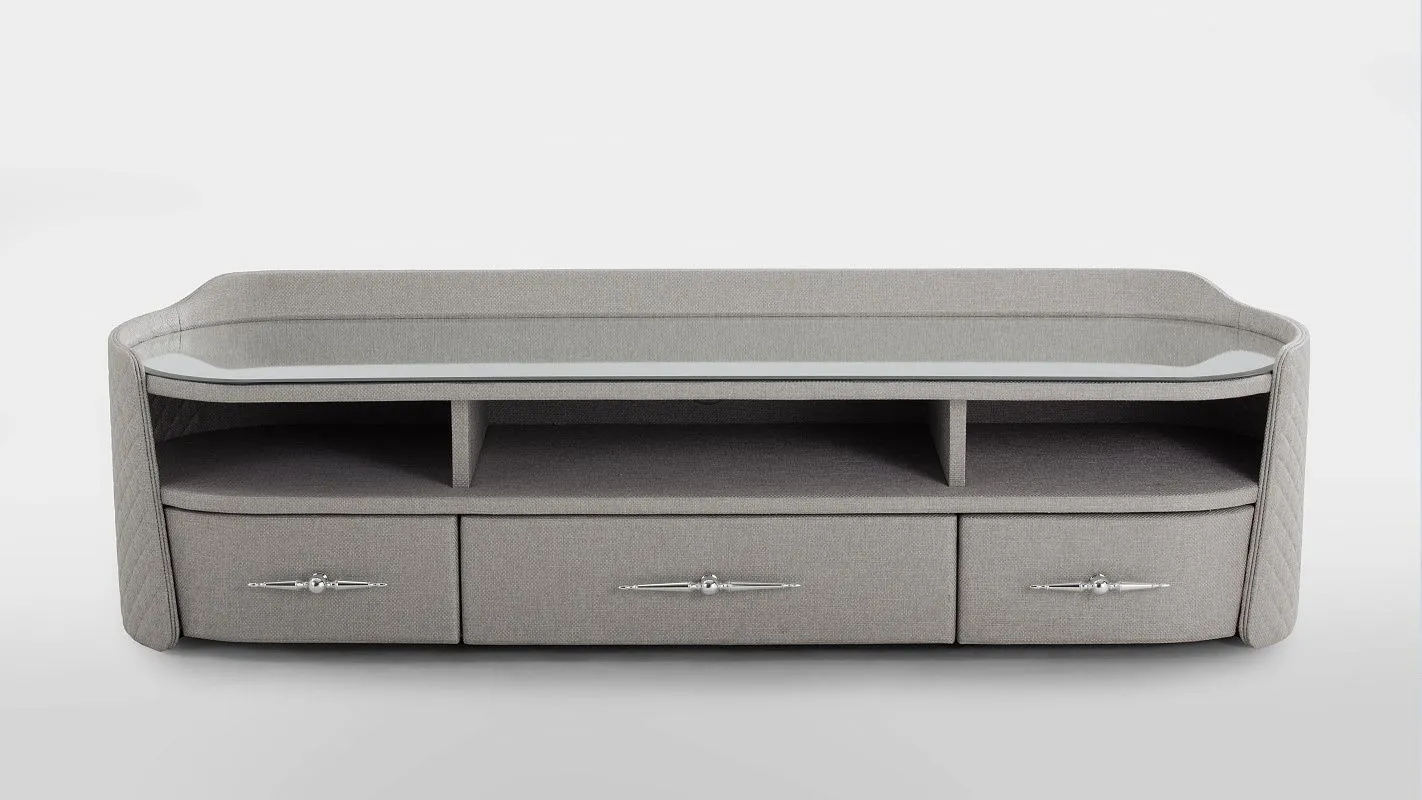 Стильная и функциональная тумба TV с тремя открытыми секциями и тремя вместительными ящиками - отличный вариант и для уютной домашней гостиной, и для модного кабинета офиса. Тумба TV ПАЛЛАДИУМ | PALLADIUM декорирована объемной стежкой и изящными металлическими ручками.
