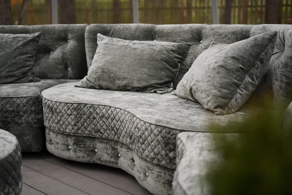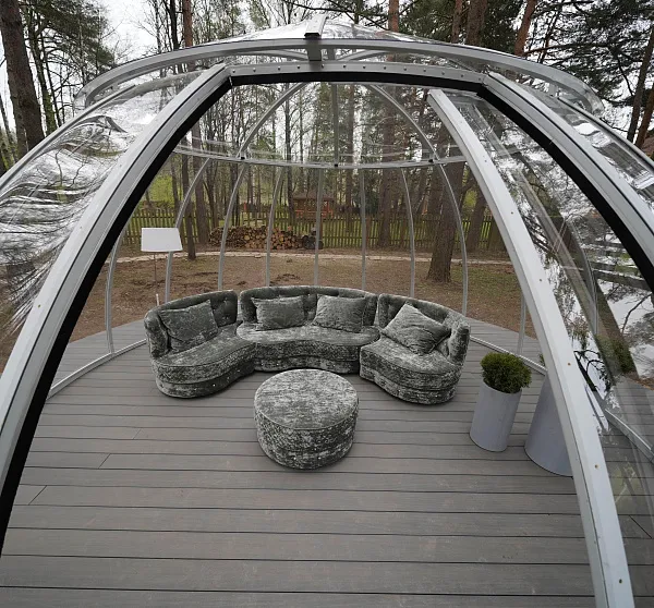 Юлия Пересильд - актриса театра и кино, заслуженная артистка России пригласила в свою загородную недвижимость съемочную группу «На дачу! С Наташей Барбье». Дизайнеры проекта подарили участку новую жизнь - просторную террасу, сказочную полянку с хрустальным очагом и космическую прозрачную беседку-купол «Иглу» на металлическом каркасе. Внутри "Иглу" идеально вписался диван «Манхэттен» в велюровой обивке цвета фисташки.